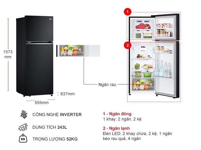 Với mức giá bình dân kết hợp cùng công nghệ hiện đại và tính năng tiện ích - chiếc tủ lạnh LG GV-B242WB sẽ một sự lựa chọn hoàn hảo cho các gia đình nhỏ có nhu cầu lưu trữ vừa phải, mang lại những thực phẩm tươi ngon, đảm bảo dinh dưỡng.